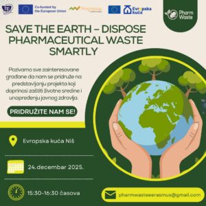 Rukovodilac projekta profesor dr Aleksandra Catić Đorđević i asistent dr Ana Kundalić su 24. decembra 2025. u Evropskoj kući u Nišu predstavile ciljeve projekta, planirane aktivnosti i upoznale javnost sa problemima farmaceutskog otpada. Prezentaciji su prisustvovali predstavnici akademske zajednice, profesori Univerziteta u Nišu, predstavnici kompanija, ekoloških organizacija, studenti doktorskih studija, istraživači i drugi zainteresovani građani.