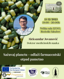 Asistent dr Aleksandar Jovanović je 15. decembra 2025. predstavio projekat članovima Biološkog istraživačkog društva „Josif Pančić“ u Beogradu. Kroz prezentaciju posebno su naglašeni ekotoksikološki aspekti i posledice nepravilnog odlaganja farmaceutskog otpada na životnu sredinu.